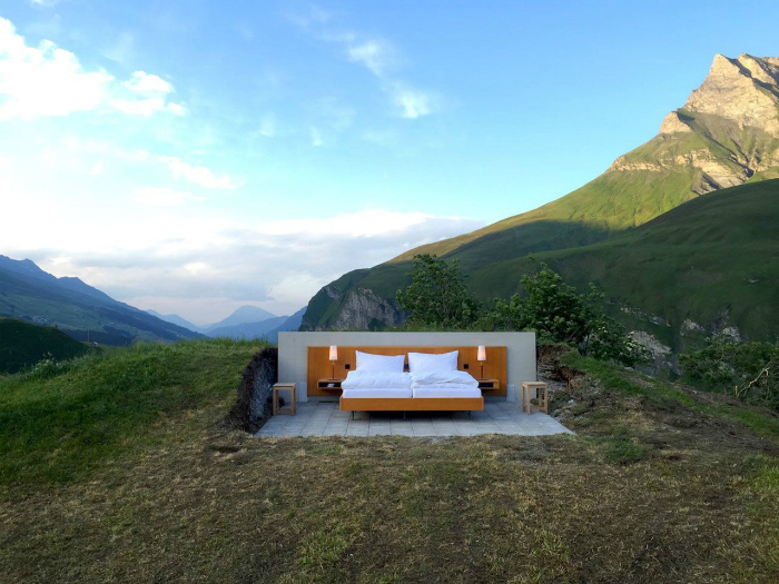 Концептуальный отель, номера которого не имеют ни стен, ни потолков. Комнаты расположены под открытым небом прямо посреди швейцарских Альп. В стоимость проживания входят услуги дворецкого и завтрак в постель.