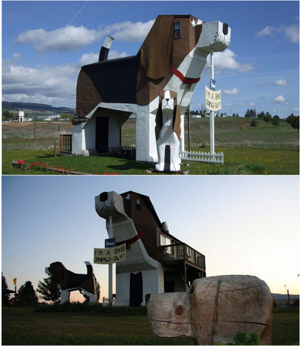 Гостиница в виде десятиметровой фигуры собаки породы Бигль, сделанной из фанеры и гипсокартона. Кроме уютных комнат на территории отеля есть сувенирный магазин и мастерская, где можно посмотреть, как вырезают свои скульптуры супруги-дизайнеры Деннис и Франсуаз, которые собственно и являются создателями данного отеля.