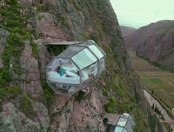 Экстремальная гостиница с прозрачными номерами, висящими на отвесной скале над пропастью в четырехстах метрах от земли. Отель включает в себя три капсулы, сделанные из алюминия и пластмассы, каждая из которых включает в себя четыре спальных места, небольшую обеденную зону, туалет и раковину. Самым большим достоинством необычной гостиницы, является ночной вид звездного неба, которым можно любоваться лежа в постели.