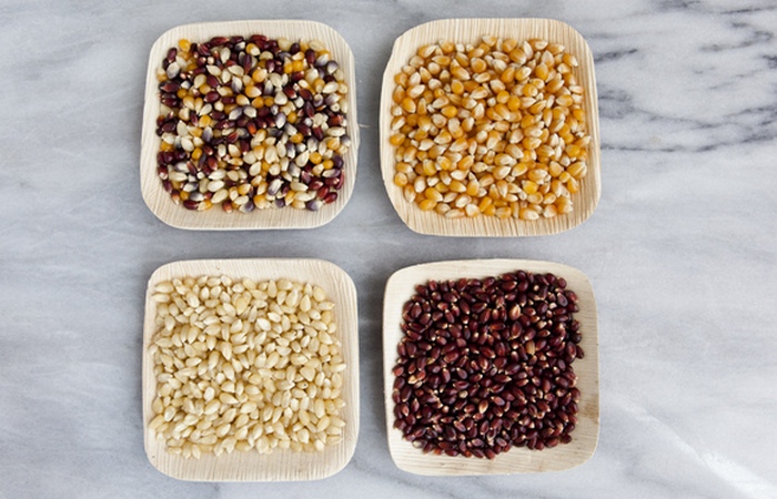 Есть шесть основных типов кукурузы: зубовидная кукуруза, кремнистая кукуруза, крахмалистая кукуруза, восковидная кукуруза, сахарная кукуруза и лопающаяся кукуруза. Ядра лопающейся кукурузы (которая используется для производства попкорна) бывают трех форм: рисообразной, жемчугообразной и южноамериканской. Большинство коммерческого попкорна делают из жемчугообразных зерен кукурузы. Главная особенность всей лопающейся кукурузы — способность ее зерен взрываться и создавать чешуйки под воздействием тепла.