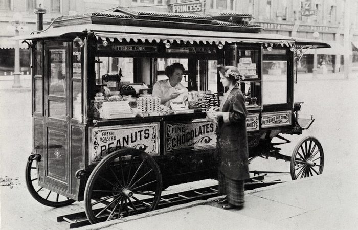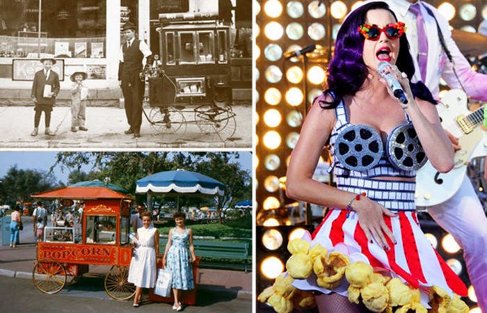 Попкорн начал продаваться в кинотеатрах с 1912 года. Это было очень выгодно, поскольку он не только продавался по завышенной цене, но и потому, что после употребления попкорна люди, как правило, испытывают жажду и покупают газированные напитки или воду.