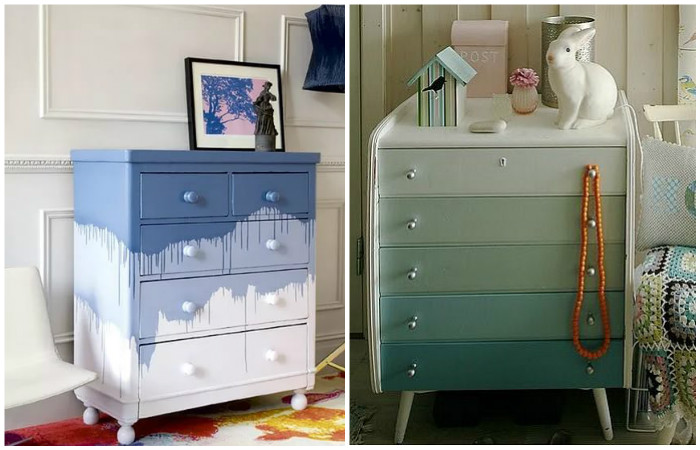Плавные переходы цвета — колористический прием, который не теряет актуальности уже последних несколько лет. Так почему бы не повторить его и на мебели? Используйте 4-5 оттенков одного цвета, окрашивая мебель по вертикали. Совсем необязательно покупать количество банок с краской, соответствующее цветам омбрэ. Можно приобрести базовый и белый цвета. Интенсивность базового цвета регулируется путем добавления в него разного количества белого.