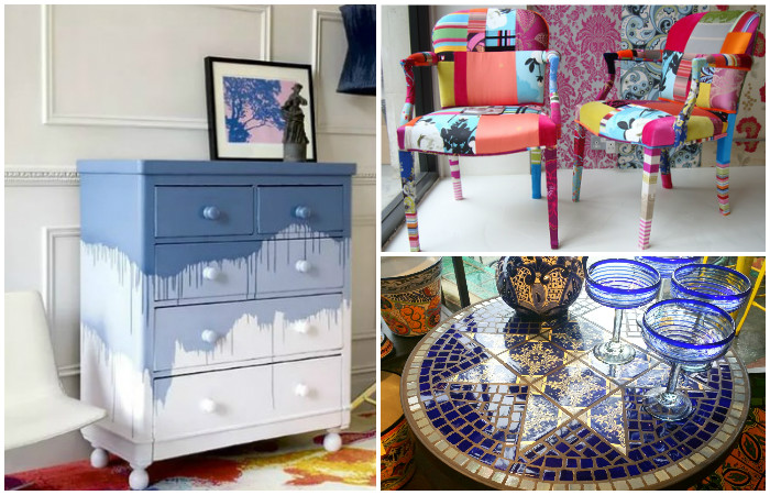 Множество ярких красок, даже не сочетающихся между собой — это все, что понадобится для преображения мебели в образец абстрактного искусства. Очистите мебель от старых лака и краска, загрунтуйте. Затем начинайте покрывать ее небольшими мазками разного цвета. Для удобства вначале нанесите первый цвет, затем второй и так далее. Чтобы оценить сочетаемость цветов, рекомендуем предварительно создать эскиз на куске плотного картона.