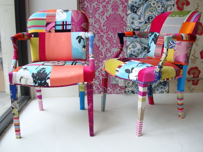 Яркие стулья станут настоящей изюминкой интерьера. Чтобы преобразить мягкое сидение, необходимо перетянуть его чехлом, сшитым из разноцветных лоскутков. А твердые ножки и спинка декорируются при помощи техники декупажа. На загрунтованную поверхность нужно приложить декупажные салфетки или вырезки из журналов, пропитанные смесью ПВА и воды. После высыхания покройте их слоем акрилового лака.