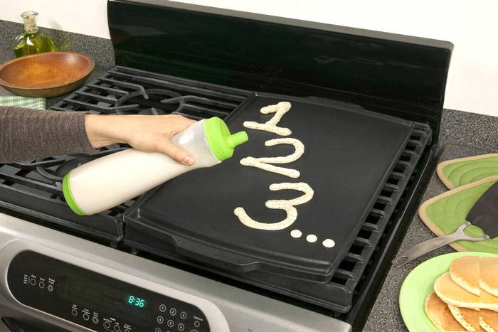 Следующий кухонный инструмент идеально подойдет для тех, у кого есть маленькие дети. Это жарочная поверхность, на которую помещается до трех блинчиков. Также в комплект входит специальный карандаш, заполняемый жидким тестом, и с помощью которого можно рисовать на жарочной поверхности, тем самым создавая необычные блины.