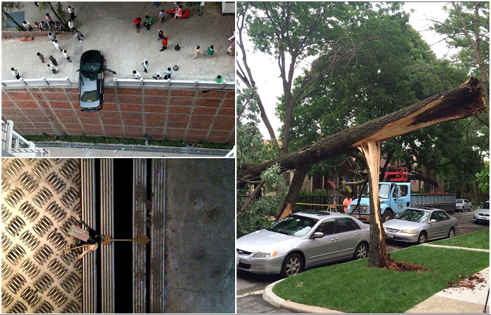 7. Это дерево могло приземлиться аккурат на припаркованный под ним автомобиль, если бы не зависло в воздухе