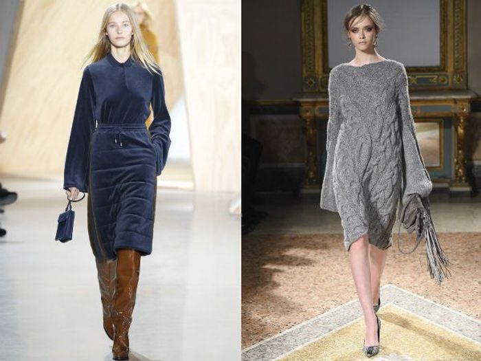 Специалисты модного дела позаботились и о том, чтобы девушки в осенне-зимнем сезоне не мёрзли, поэтому смело ввели вязаный тренд. Актуально носить платья любой вязки и расцветки, главное, чтобы в таком изделии было удобно и тепло.