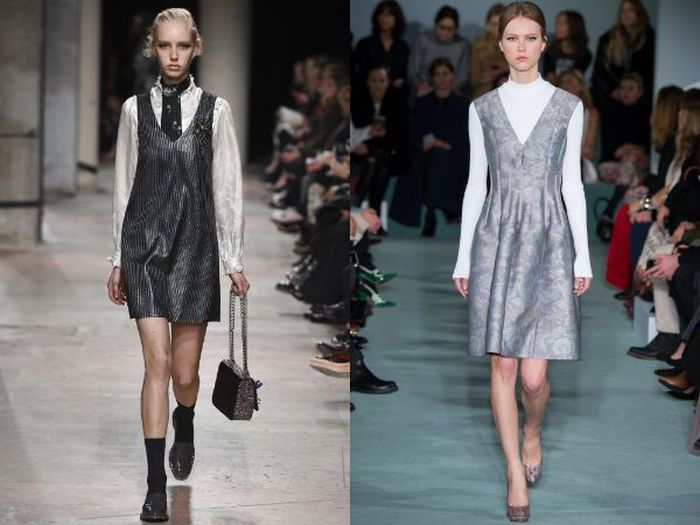 Этой осенью дизайнеры решили вспомнить школьные годы и предложили модницам платья в стиле школьной формы. У таких моделей длина до колена, а цветовая гамма и покрой довольно сдержанные. Носить их рекомендуют в комплекте с простыми белыми блузами, макияж делать не броский, а причёску аккуратную.