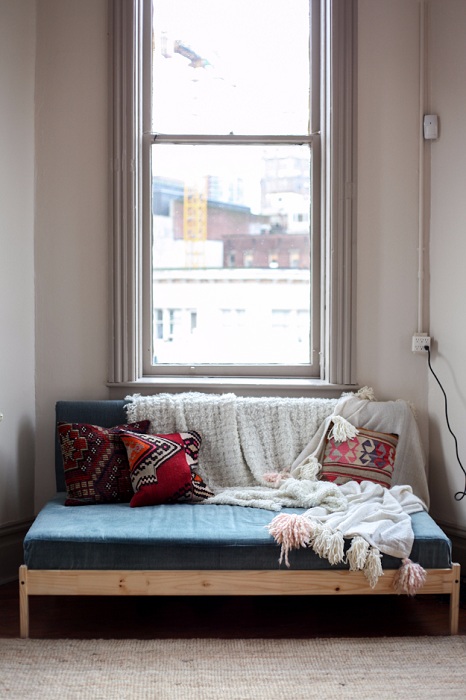 Интересный интерьер с мини-софой, что прост и практичен одновременно.