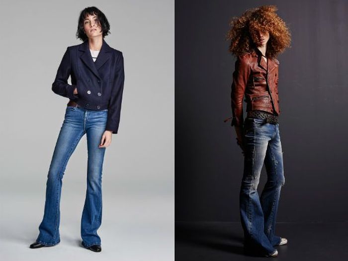 Клёш от колена – модный дар середины прошлого века, который снова актуален. Некоторые стилисты создают модели с гиперрасширением, начинающимся прямо у бедра. В этом сезоне такие джинсы рекомендуют носить с короткими джинсовыми куртками.