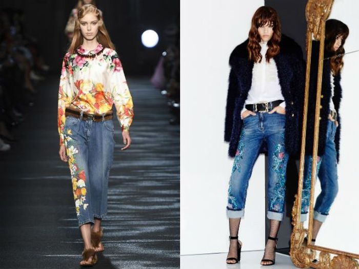 Один з ярких трендов осенне-зимнего периода – красивая ручная вышивка. Основной мотив, используемый мастерами – флористический. Яркие цветы, объёмные листья, бусины и стразы разных форм и расцветок в качестве декора. На такие джинсы явно обратят внимание, главное, чтобы вышивка не оказалась на проблемных местах, например, на очень широких бёдрах.