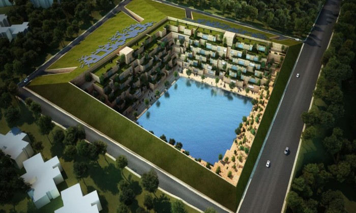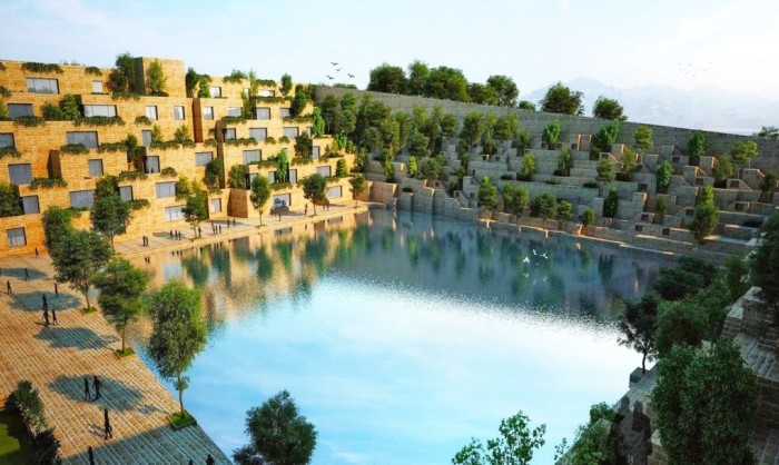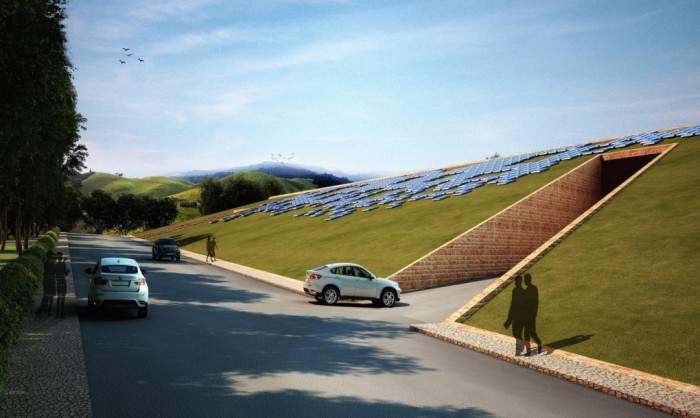 Заполненный водой резервуар станет естественным способом охлаждать воздух, создавая комфортный микроклимат для работы. На холме будут установлены батареи, генерирующие энергию солнца.