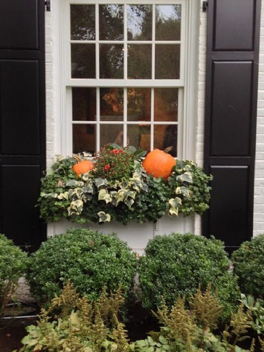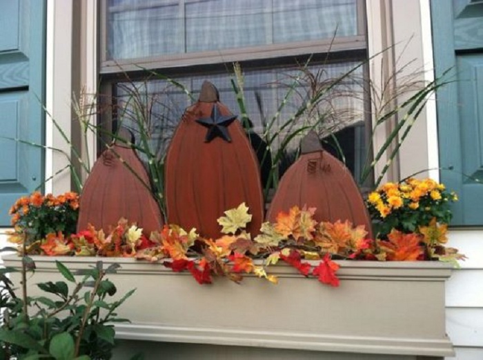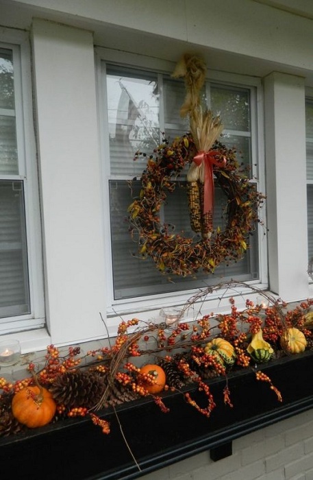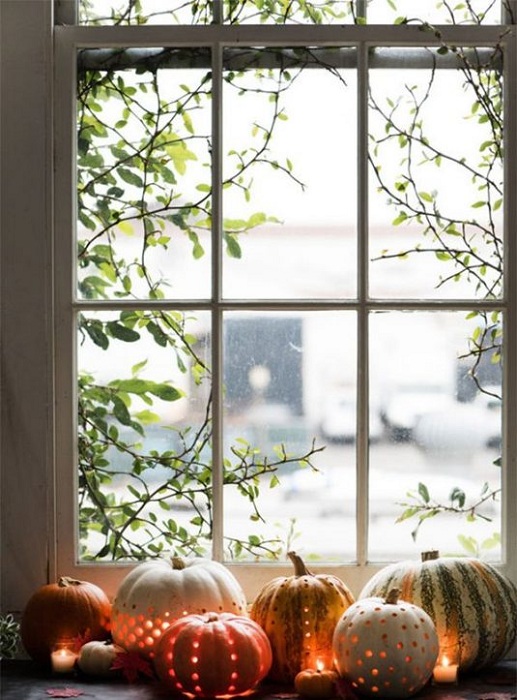 Оформление подоконника со стороны двора при помощи тыкв, что создаст осеннее настроение и придаст определенного шарма интерьеру.