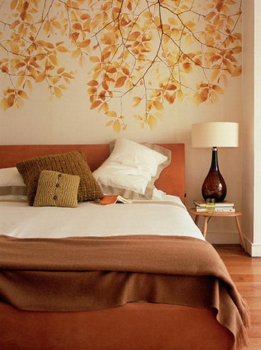Отменное настроение подарит роспись осенними листьями стены, что не только понравится, но и создаст уютную обстановку в любой комнате.