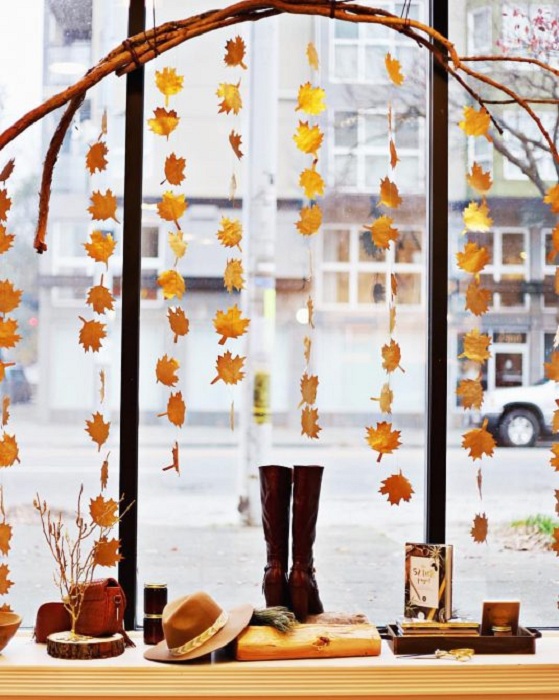 Прекрасный вариант оформления окна при помощи подручных предметов, что понравится и создаст осеннее настроение.