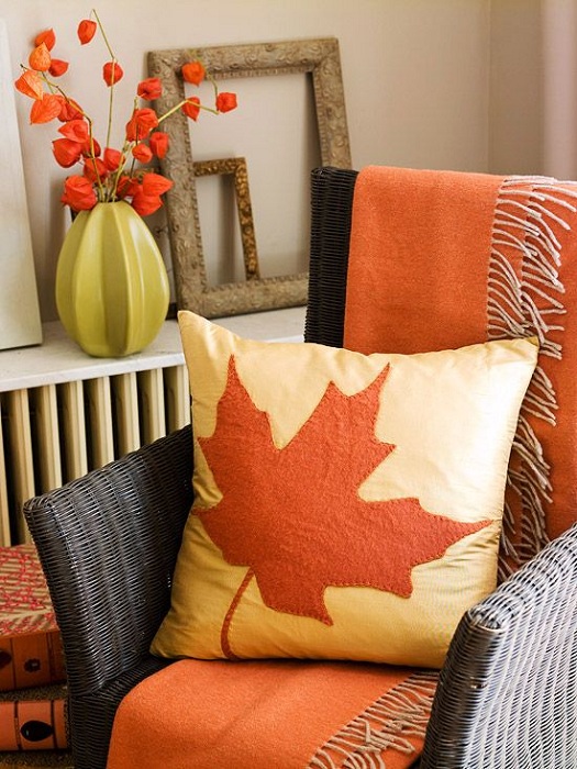 Простое оформление комнаты с теплым пледом, уютом и осенними украшениями позволит окунуться сполна в теплое осеннее настроение.