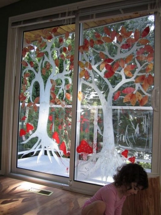 Осеннюю обстановку возможно создать благодаря просто отличной росписи стекл, то что понравится точно и создаст интересную обстановку.