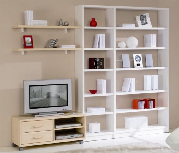Интерьер гостиной комнаты преображен благодаря оригинальным светлым полкам, что вдохновят и точно понравятся.