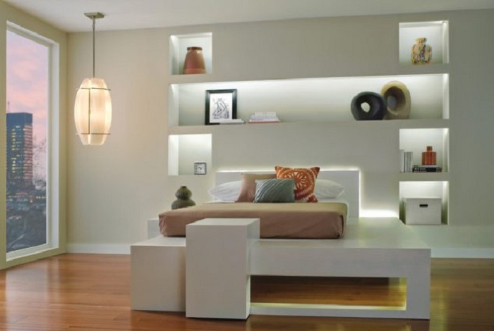 Интересное решение для оформления интерьера спальной с оригинальными нишами в стене, что вдохновят.