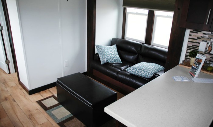 В «раздвинутом» состоянии площадь домика на колесах составляет всего 23 квадратных метров. Грамотная планировка в ограниченном пространстве позволила архитекторам компактно распределить все необходимое для комфортного проживания. В гостиной раздвижной диван создаст дополнительное спальное место. На кухне есть газовая печь на три конфорки, духовой шкаф, холодильник, шкафы для хранения бытовых принадлежностей. В санузле находится компостный туалет, душ и раковина.