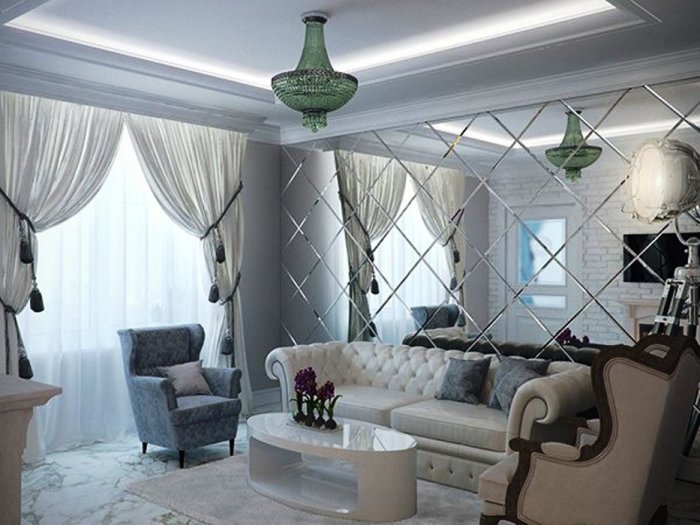 В интерьер гостиной органично вписываются зеркальные панно, выполненные в художественном стиле.