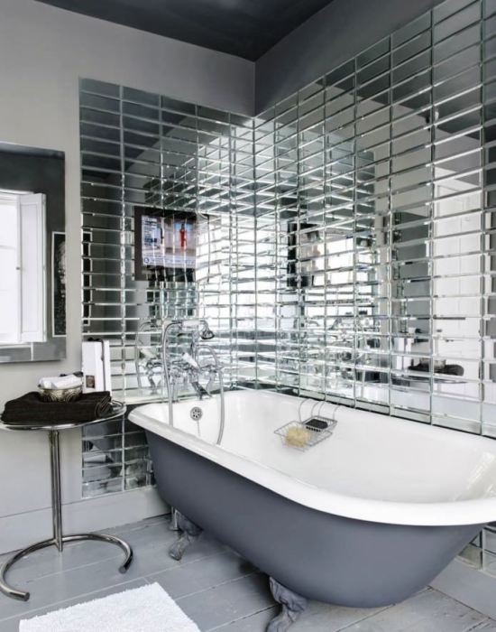 Использование зеркальной плитки на одной из стен будет вполне уместным.